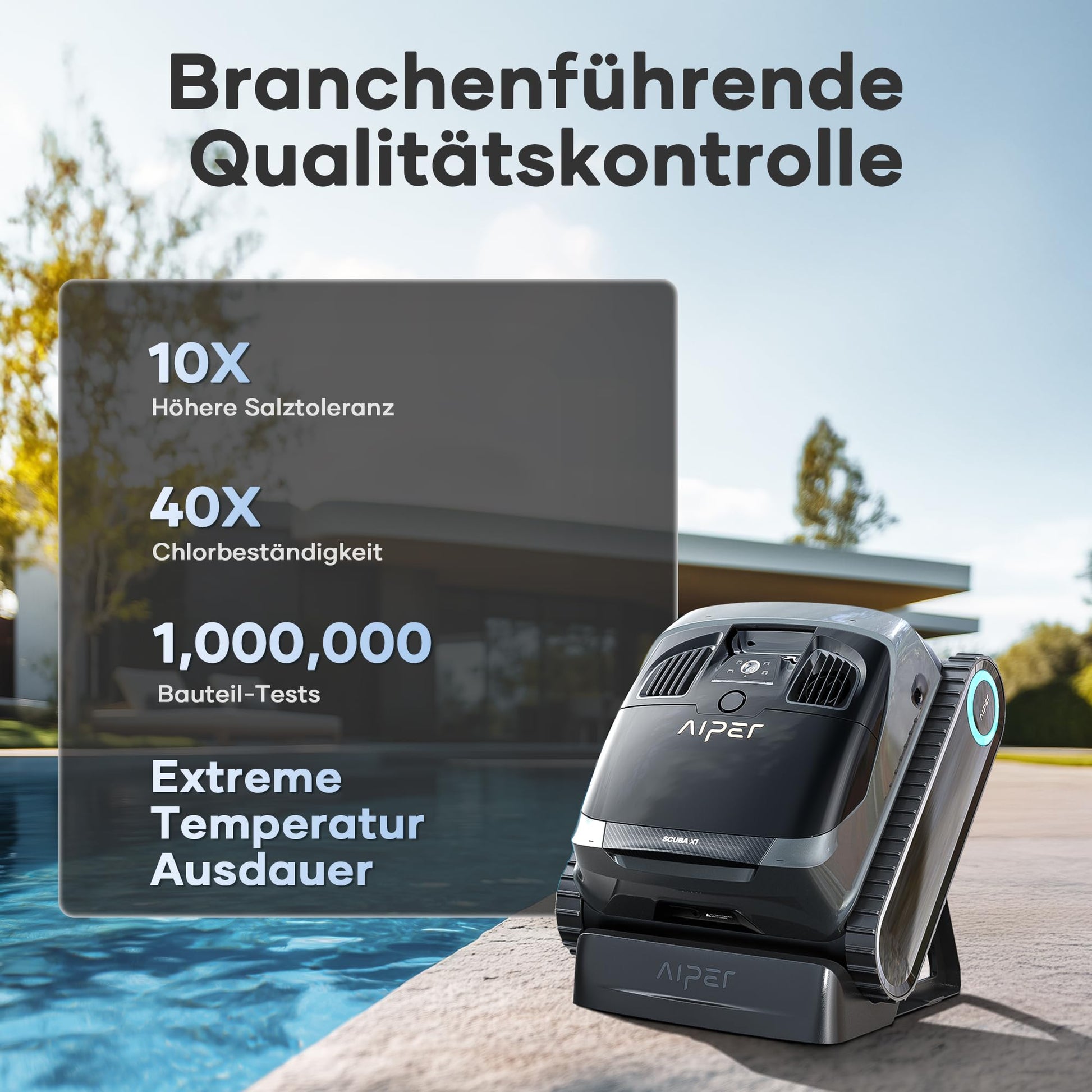 • Hinweis zur Unterwasserkommunikation: Der Poolroboter unterstützt unter Wasser keine direkte Verbindung zur Aiper-App. Für Unterwasser-Überwachung, Fernsteuerung und Rückholfunktion muss der Poolroboter mit dem HydroComm Pro/Pure verbinden (Separat erhältlich, nicht im Lieferumfang enthalten). Mit 2 Jahren Garantie für maximale Zuverlassiakeit