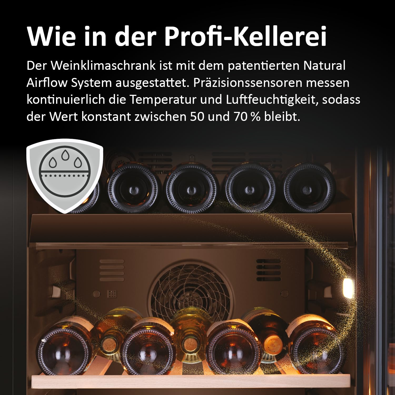Das patentierte Natural Airflow System sorgt für optimale Bedingungen wie in einer Weinkellerei. Präzisionssensoren überwachen Temperatur und Luftfeuchtigkeit, während ein intelligentes Lüftungssystem den Feuchtigkeitswert konstant zwischen 50 und 70 % hält. Verdunstetes Wasser wird zudem gleichmäßig im Innenraum verteilt.