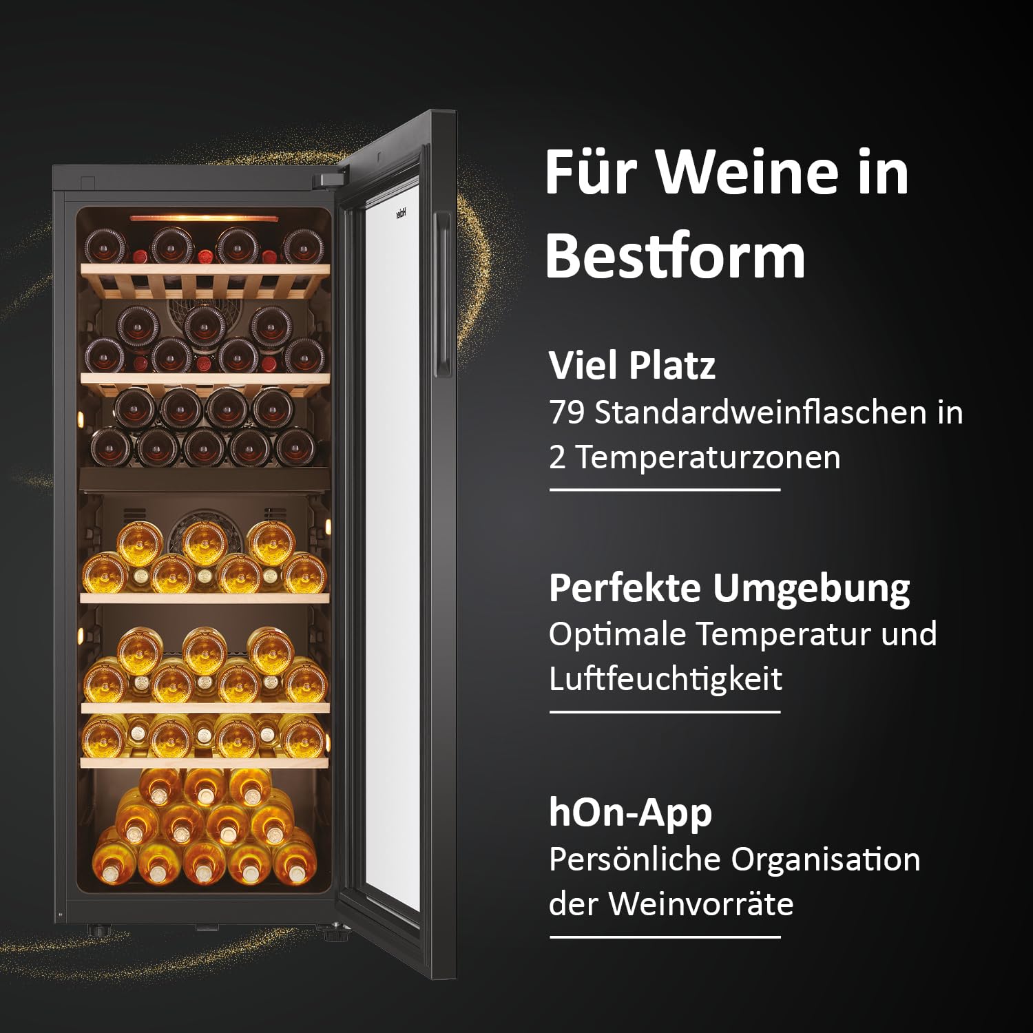- Weinlagerung auf höchstem Niveau: Der Haier Weinklimaschrank WINE BANK 50 SERIE 5 bietet auf nur 49,5 cm Breite sehr viel Platz für bis zu 79 Flaschen und sorgt mit präziser Temperatursteuerung in zwei separaten Zonen für perfekte Lagerbedingungen. Dank konstanter Luftfeuchtigkeit, natürlicher Luftzirkulation und UV-undurchlässigem Glas bleiben Geschmack, Aroma und Qualität jeder Flasche erhalten.