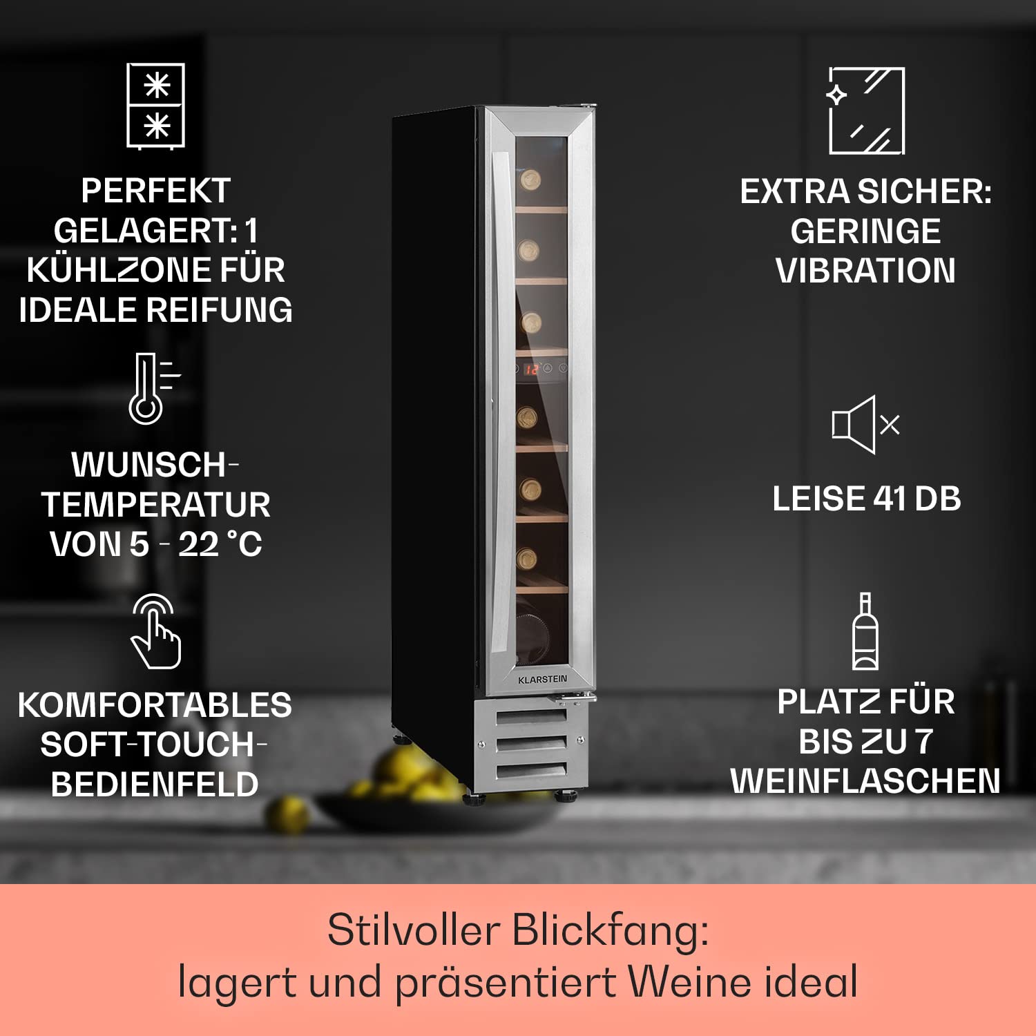 - 1 ZONEN WEINKÜHLSCHRANK: In diesem Flaschenkühlschrank kannst du bis zu 7 Flaschen deiner besten Weinflaschen lagern. Die Klarstein Weinkühlschränke sorgen für die richtige Temperatur, damit sich der Geschmack und das Aroma entfalten können.